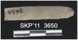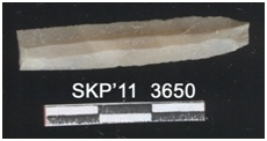| Description / विवरण | Broken chert blade, it is long and rectangular in structure. The ridges can be seen clearly it is trapezium in cross section. The sides are retouched and the ventral surface is plain. |