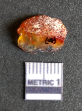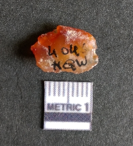 | Description / विवरण | The Carnelian flake roughout shows flake scars owing to the cryptocrystalline material and a bulb of percussion as a result of flaking activity. The piece is reddish in colour due to heat treatment. Carnelian is commonly used for bead manufacture in the Harappan context. |