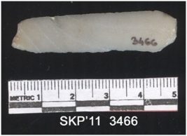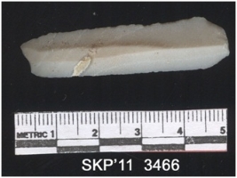 | Description / विवरण | Broken chert blade, it is long and rectangular in structure. The ridges can be seen and the sides are retouched. It is triangular in cross section. |
