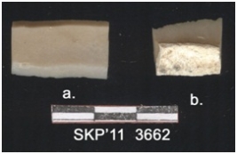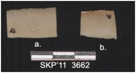 | Description / विवरण | Broken chert blade, the sides are retouched, the ventral surface is plain. Triangular in cross section. |