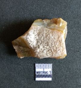 | Description / विवरण | The chalcedony piece is a part of lithic debitage as a result of lithic knapping. The characteristic amber yellowish colour of this material has made it a popular semi-precious stone for bead manufacture, etc. The cryptocrystalline material shhows flake scars and sharp cut edges due to flaking. Bulb of percussin is visible on the proximal end. |