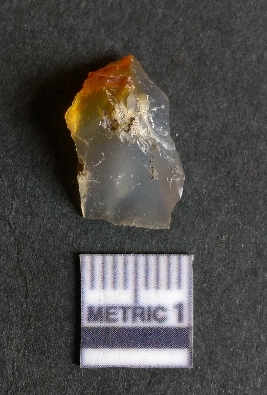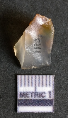 | Description / विवरण | The chalcedony piece is a part of lithic debitage as a result of lithic knapping. The characteristic amber yellowish colour of this material has made it a popular semi-precious stone for bead manufacture, etc. The cryptocrystalline material shhows flake scars and sharp cut edges due to flaking. Bulb of percussin is visible on the proximal end. |