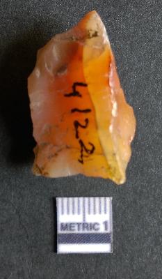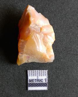 | Description / विवरण | The chalcedony piece is a part of lithic debitage as a result of lithic knapping. The characteristic amber yellowish colour of this material has made it a popular semi-precious stone for bead manufacture, etc. The cryptocrystalline material shhows flake scars and sharp cut edges due to flaking. Bulb of percussin is visible on the proximal end. |