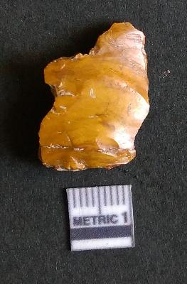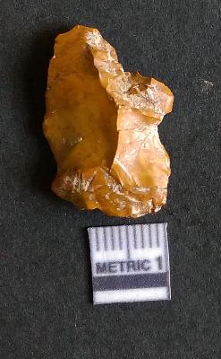 | Description / विवरण | The chert flake shows prominent bulb of percussion on the proximal end. The flake also shows the process of core reduction or retouch owing to the secondary flaking. The flake rigdes are also visible. |