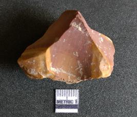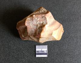 | Description / विवरण | The chert flake shows prominent bulb of percussion on the proximal end. The flake also shows the process of core reduction or retouch owing to the secondary flaking. The flake rigdes are also visible. |
