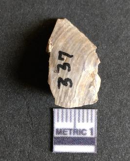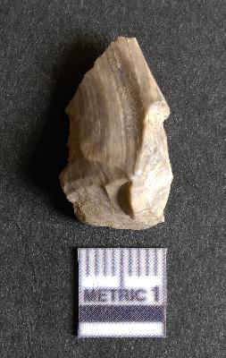 | Description / विवरण | The chert flake shows prominent bulb of percussion on the proximal end. The flake also shows the process of core reduction or retouch owing to the secondary flaking. The flake rigdes are also visible. |