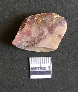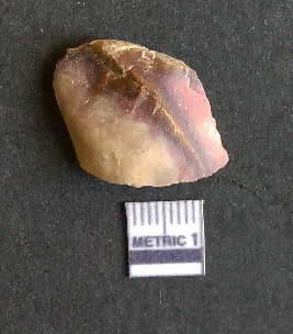 | Description / विवरण | The chert flake shows prominent bulb of percussion on the proximal end. The flake also shows the process of core reduction or retouch owing to the secondary flaking. The flake rigdes are also visible. |