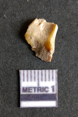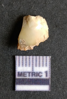 | Description / विवरण | The chert flake shows prominent bulb of percussion on the proximal end. The flake also shows the process of core reduction or retouch owing to the secondary flaking. The flake rigdes are also visible. |