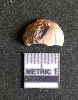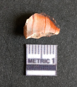 | Description / विवरण | The chert flake shows prominent bulb of percussion on the proximal end. The flake also shows the process of core reduction or retouch owing to the secondary flaking. The flake rigdes are also visible. |