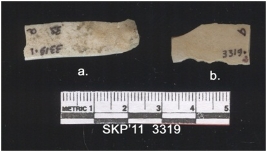 | Description / विवरण | Broken chert blade, the ridges can be seen clearly and the sides are retouched. Trapezium and triangular in cross section, the ventral surface is plain. |