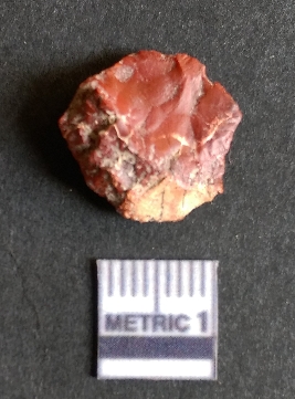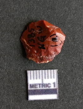 | Description / विवरण | The chert flake shows prominent bulb of percussion on the proximal end. The flake also shows the process of core reduction or retouch owing to the secondary flaking. The flake rigdes are also visible. |