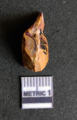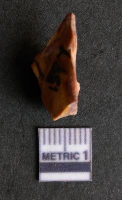| Description / विवरण | The chert flake shows prominent bulb of percussion on the proximal end. The flake also shows the process of core reduction or retouch owing to the secondary flaking. The flake rigdes are also visible. |