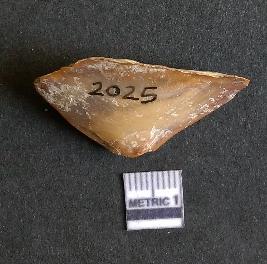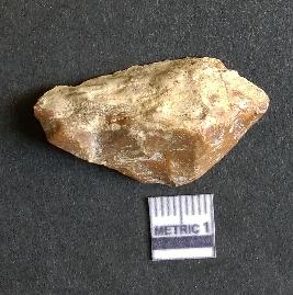 | Description / विवरण | The chert flake shows prominent bulb of percussion on the proximal end. The flake also shows the process of core reduction or retouch owing to the secondary flaking. The flake rigdes are also visible. |