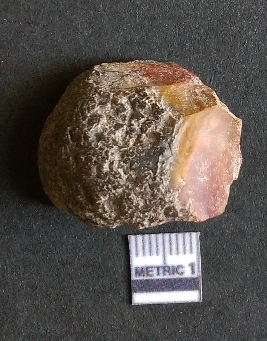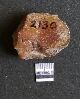 | Description / विवरण | The chert flake shows prominent bulb of percussion on the proximal end. The flake also shows the process of core reduction or retouch owing to the secondary flaking. The flake rigdes are also visible. |