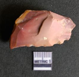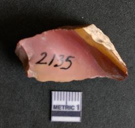 | Description / विवरण | The chert flake shows prominent bulb of percussion on the proximal end. The flake also shows the process of core reduction or retouch owing to the secondary flaking. The flake rigdes are also visible. |