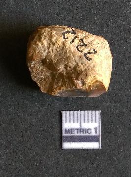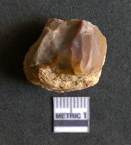 | Description / विवरण | The chert flake shows prominent bulb of percussion on the proximal end. The flake also shows the process of core reduction or retouch owing to the secondary flaking. The flake rigdes are also visible. |