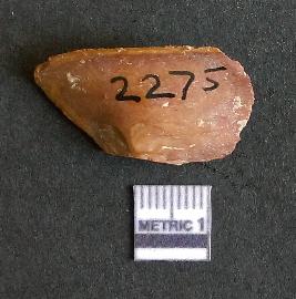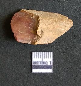 | Description / विवरण | The chert flake shows prominent bulb of percussion on the proximal end. The flake also shows the process of core reduction or retouch owing to the secondary flaking. The flake rigdes are also visible. |