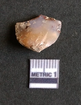 | Description / विवरण | The chert flake shows prominent bulb of percussion on the proximal end. The flake also shows the process of core reduction or retouch owing to the secondary flaking. The flake rigdes are also visible. |
