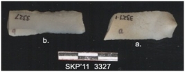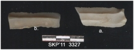 | Description / विवरण | Broken chert blades, rectangular in structure and is triangular in cross section. The ridges can be seen clearly and the sides are retouched. |