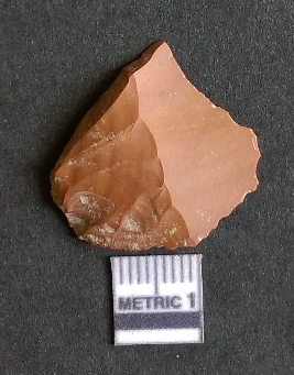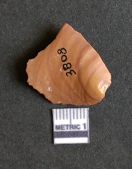 | Description / विवरण | The chert flake shows prominent bulb of percussion on the proximal end. The flake also shows the process of core reduction or retouch owing to the secondary flaking. The flake rigdes are also visible. |