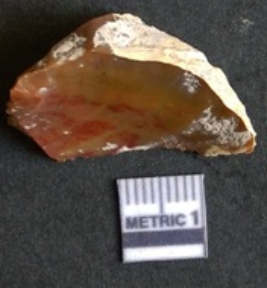 | Description / विवरण | The chert flake shows prominent bulb of percussion on the proximal end. The flake also shows the process of core reduction or retouch owing to the secondary flaking. The flake rigdes are also visible. |