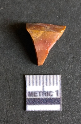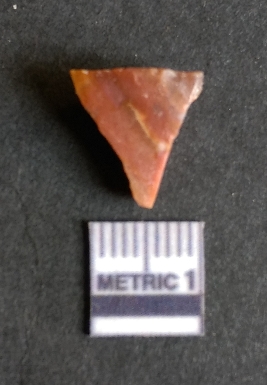 | Description / विवरण | The chert flake shows prominent bulb of percussion on the proximal end. The flake also shows the process of core reduction or retouch owing to the secondary flaking. The flake rigdes are also visible. |