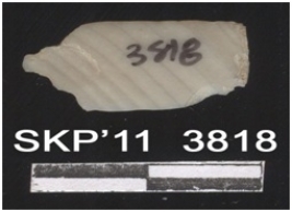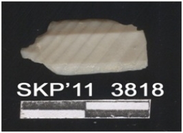 | Description / विवरण | Broken chert blade, the ridges can be seen, the sides are sharp. It is trapezium in cross section. The ventral surface is plain. |