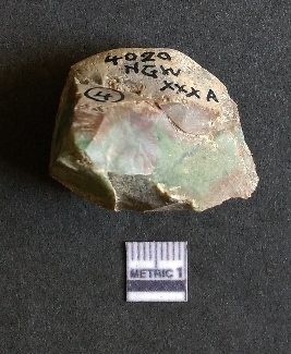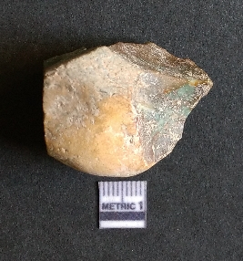 | Description / विवरण | The chert flake shows prominent bulb of percussion on the proximal end. The flake also shows the process of core reduction or retouch owing to the secondary flaking. The flake rigdes are also visible. |