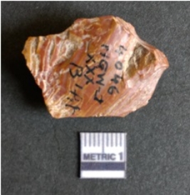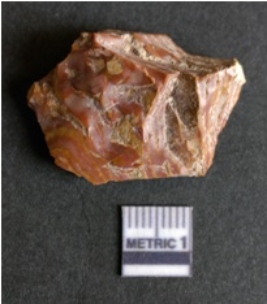 | Description / विवरण | The chert flake shows prominent bulb of percussion on the proximal end. The flake also shows the process of core reduction or retouch owing to the secondary flaking. The flake rigdes are also visible. |