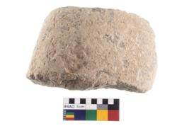 | Description / विवरण | A partially broken specimen of a oval shaped Mueller stone with oval section and concave end. |