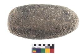 | Description / विवरण | A partially broken specimen of a oval shaped Mueller stone with oval section and concave end. |