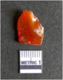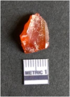 | Description / विवरण | The Carnelian flake roughout shows flake scars owing to the cryptocrystalline material and a bulb of percussion as a result of flaking activity. The piece is reddish in colour due to heat treatment. Carnelian is commonly used for bead manufacture in the Harappan context. |