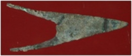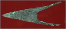 | Description / विवरण | Trench WC 2, Qdt 2, layer 3, depth 36-65 cm It is a thin arrow head made of copper. Shape is triangular and it has one tip on top and two tips on bottom. Patina is present on it. |