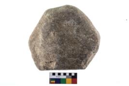 | Description / विवरण | A partially broken specimen of an rouhly circular shaped rubber stone with one side flat. |