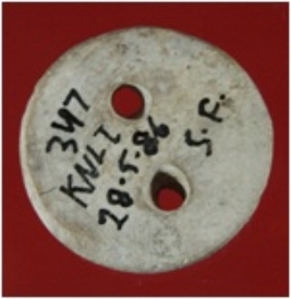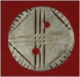 | Description / विवरण | Trench Surface Find It is a button made of shell. Beautiful design is done on it. Shape is circular and surface is rough with creamish appearance. Two holes are passing through it. |