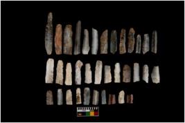 | Description / विवरण | A set of 35 intact microlithic blades. Within this assemblage, 28 are made up of chalcedony, 2 are made up of chert, 2 are made up of milky quartz, 1 is made up odf jasper, 1 is made up of agate and remaining 1 is made up of carnellian. All these blades have retoching and sharp edges. |