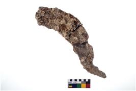 | Description / विवरण | A specimen of an incomplete iron sickle broken into two pieces. It is highly rusted. |