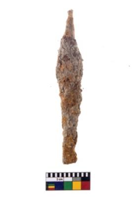 | Description / विवरण | A specimen of an iron nail with rounded top tapering towards the end. It is highly rusted. |