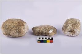 | Description / विवरण | Three hammer stones roughly round in shape of which one is Broken. |