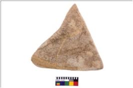 | Description / विवरण | Worked stone in Sandstone material is with rustic surface and triangular in shape. One side of the triangle has curvilinear shape |