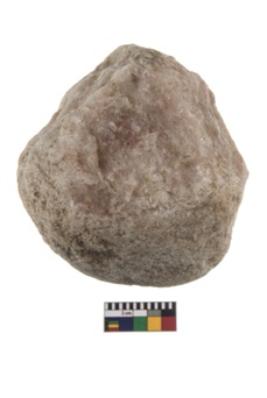 | Description / विवरण | Partially broken specimen of hammer stone made up from quartz with battered surface |