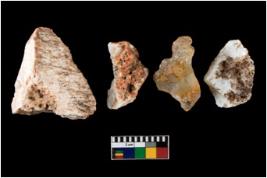 | Description / विवरण | There are n-4 of intact cores. Out of them 2 are made up of Chalcedony and 2 are made up of Chert. There are multidirectional irregular dominant scar pattern on both dorsal and ventral face of the cores. |