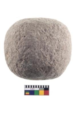 | Description / विवरण | A partially broken specimen of roughly round shaped hammer stone with battered periphery along with the circumference. |