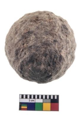 | Description / विवरण | A partially broken speciemen of stone sling ball, small in size, flat base and with smooth surface. |
