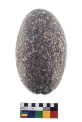 | Description / विवरण | A partially broken specimen of an oval shaped rubber stone with oval section and concave end. |