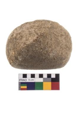 | Description / विवरण | Partially broken specimen of an oval shaped muller stone with rectangular section and rough surface made up from quartzite |