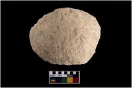 | Description / विवरण | A partially broken specimen of a spherical shaped sling ball made up from quartz. |