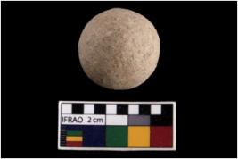 | Description / विवरण | A complete specimen of a round shaped sling ball made up from quartz. |