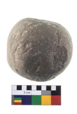 | Description / विवरण | A partially broken specimen of roughly round shaped hammer stone with battered periphery along with the circumference |