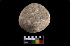 | Description / विवरण | A partially broken specimen of a spherical shaped muller stone |